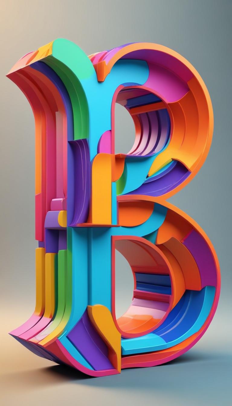 A colorful 3D letter B is artistically shaped with bright hues, showcasing unique curves and patterns. The sculpture stands against a smooth backdrop.