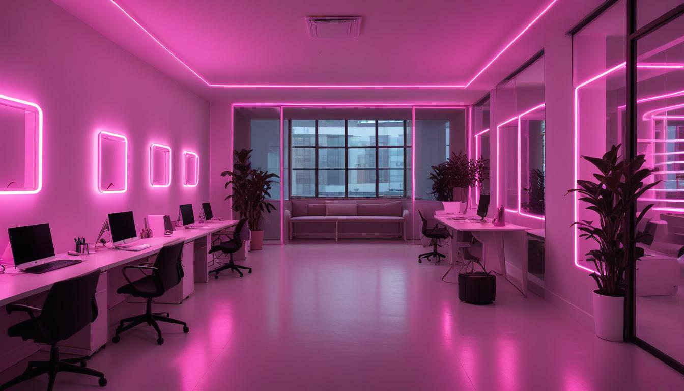 Bright modern office features pink neon lights, sleek desks, and plants. The clean space offers a relaxed atmosphere for creativity and collaboration.