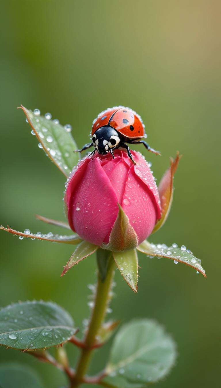A ladybug rests on a pink rosebud, surrounded by glistening water droplets. The scene captures the beauty of nature after rain.