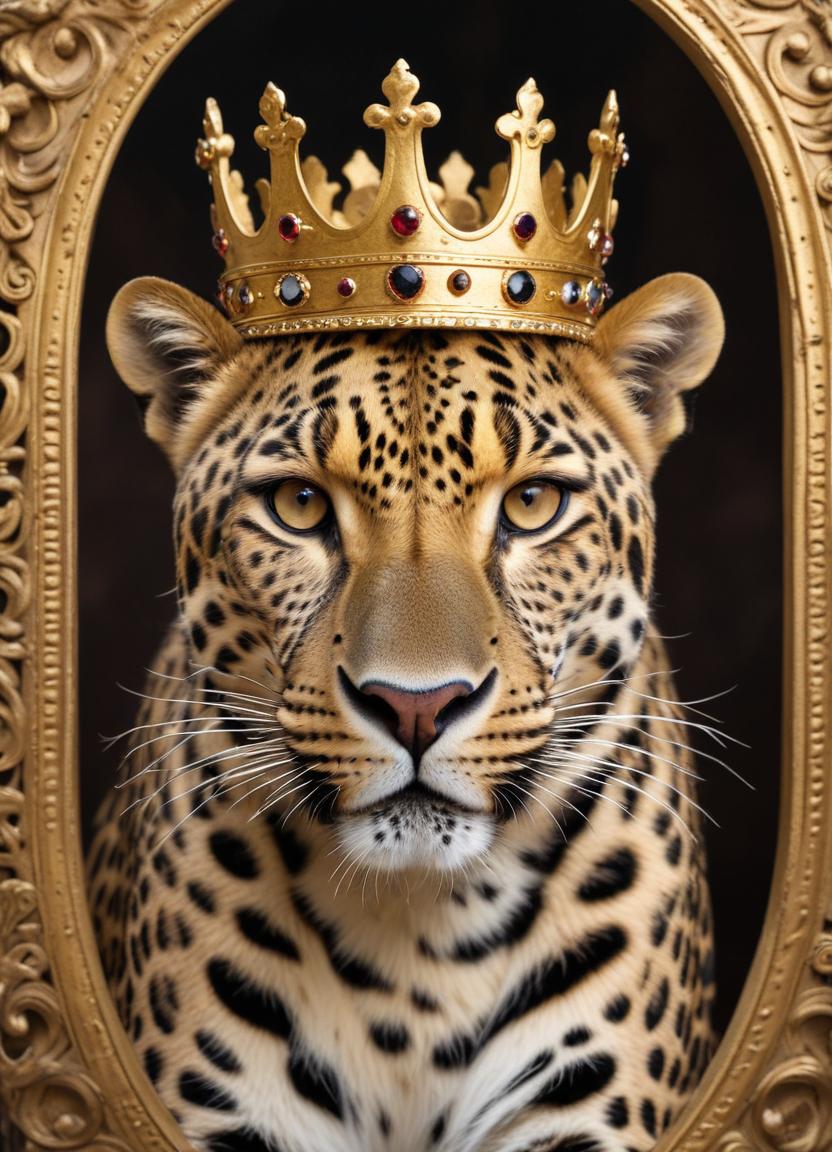 A leopard with striking spots poses proudly in a grand frame, adorned with a golden crown. Its intense gaze captures the essence of royalty.