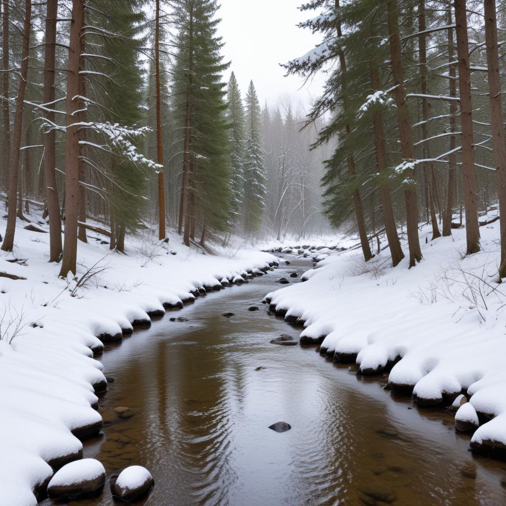 A peaceful stream flows through a snow-covered forest. Tall pine trees line the banks, creating a calm winter atmosphere.