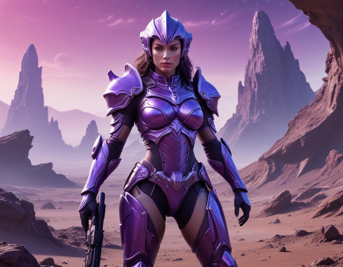 A strong female warrior stands confidently in a sci-fi landscape. She wears shiny purple armor and holds a futuristic weapon, ready for battle.
