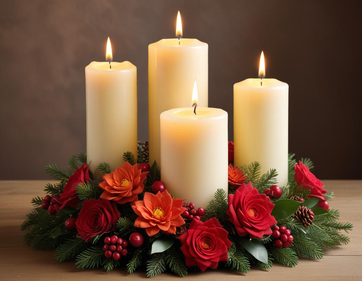 Four tall candles surrounded by vibrant red flowers and greenery create a warm, festive atmosphere for the holiday season.