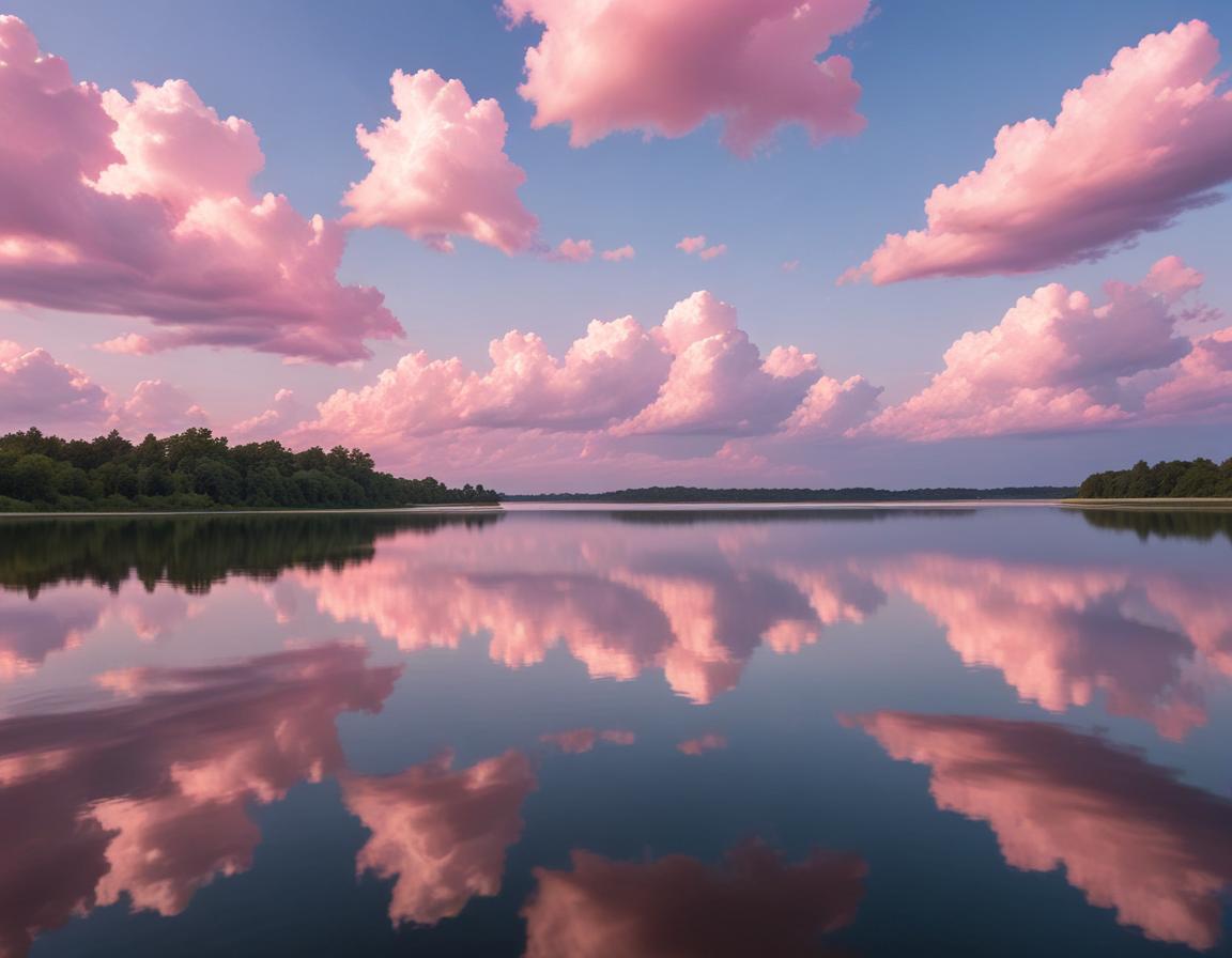 A tranquil lake reflects soft pink clouds as the sun sets. The calm water creates a beautiful mirror effect in the peaceful environment.