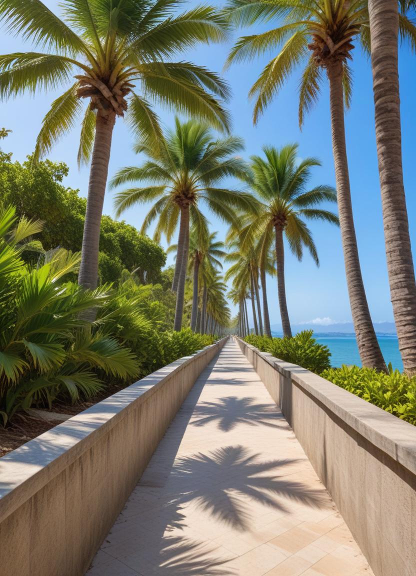 Tall palm trees frame a sunny walkway leading to the ocean, creating a serene atmosphere perfect for strolls or relaxation.