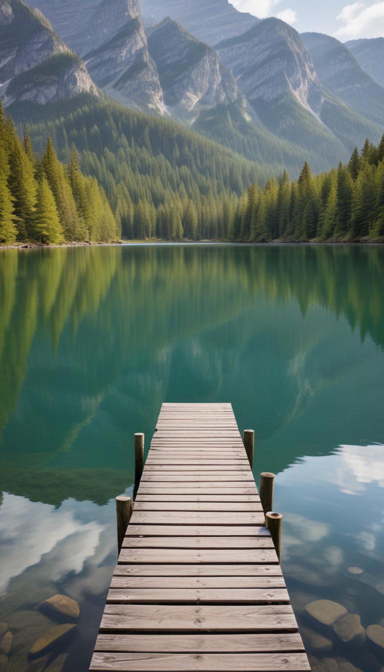 A wooden dock extends over calm waters surrounded by tall trees and stunning mountains on a clear day. Nature offers serene beauty.