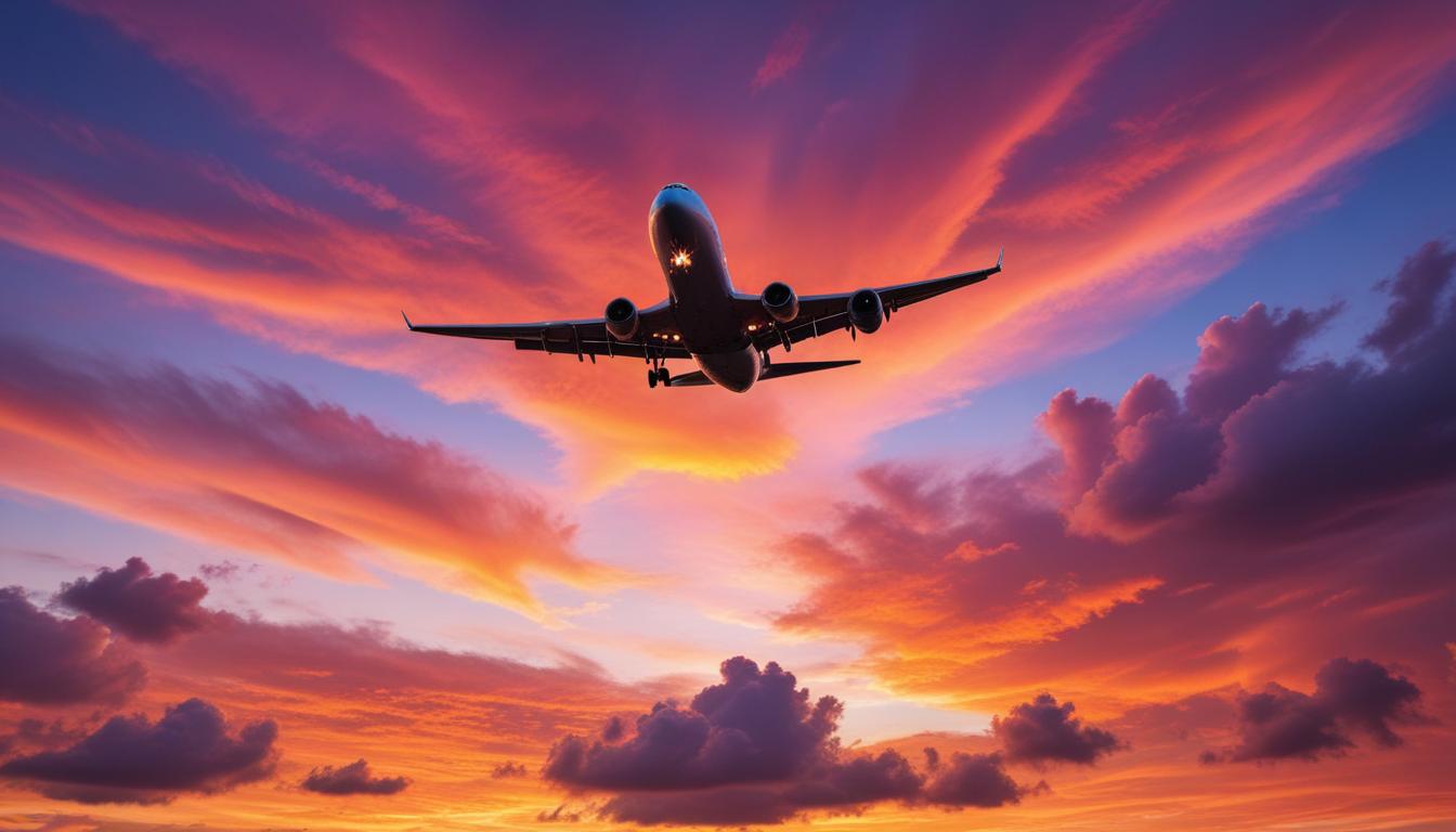 An airplane approaches for landing against a vibrant sunset sky filled with colorful clouds. The scene captures the beauty of evening travel.