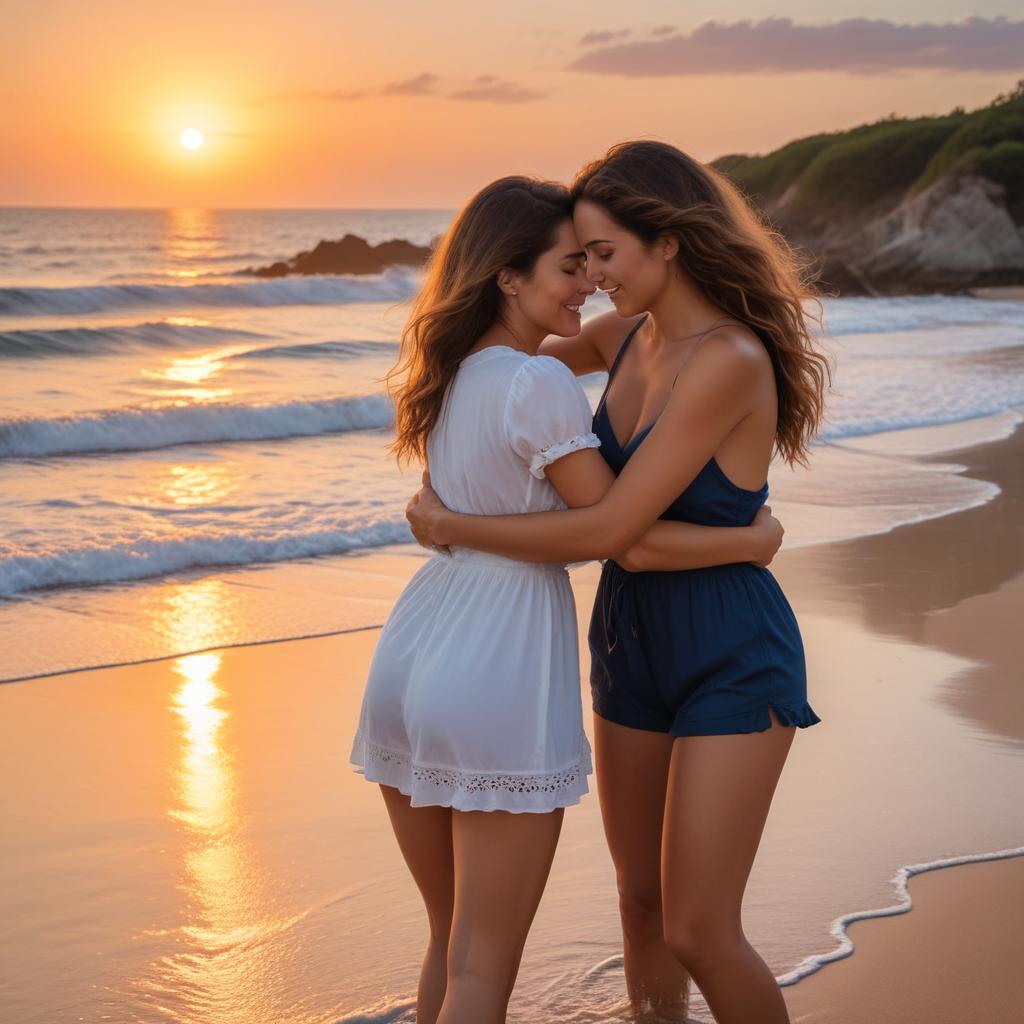 Two women share a joyful embrace on a sandy beach during a vibrant sunset, with gentle waves lapping at their feet.