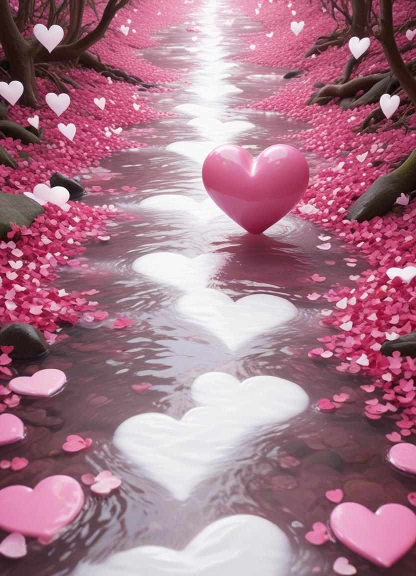 A serene stream flows through a path covered in pink heart-shaped petals. Lush trees line the banks, creating a romantic setting at sunset.