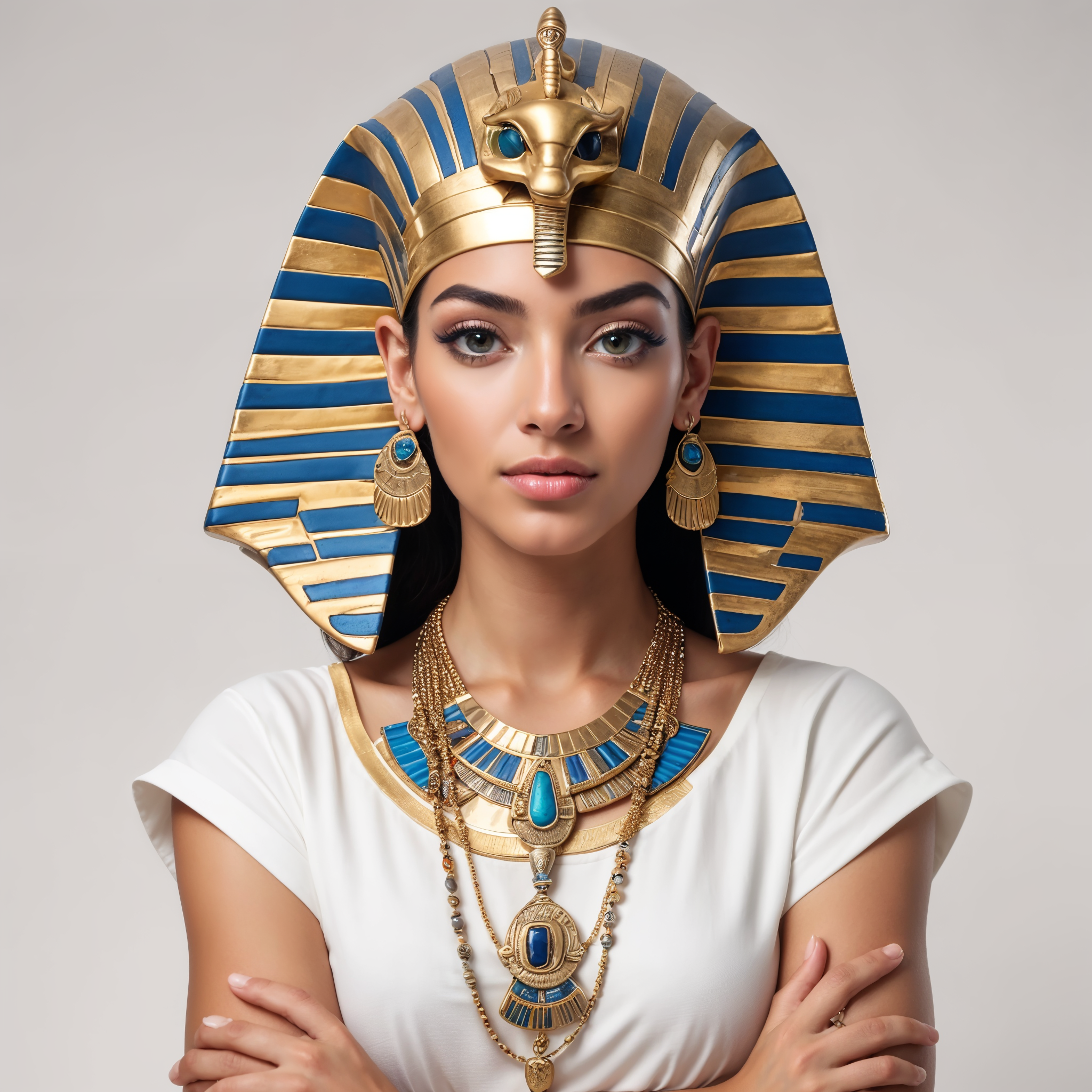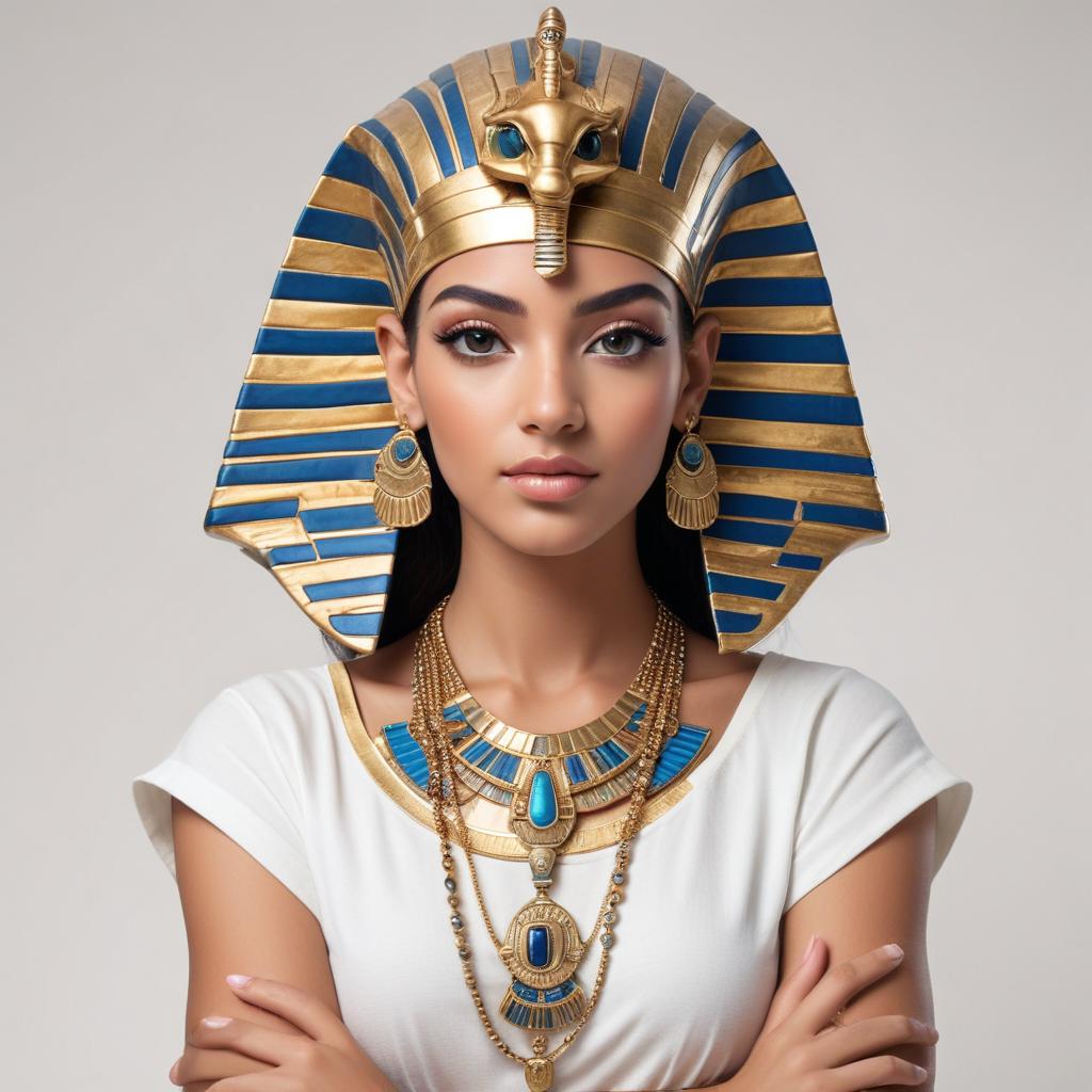 A young woman poses elegantly, wearing a detailed ancient Egyptian headdress and jewelry.