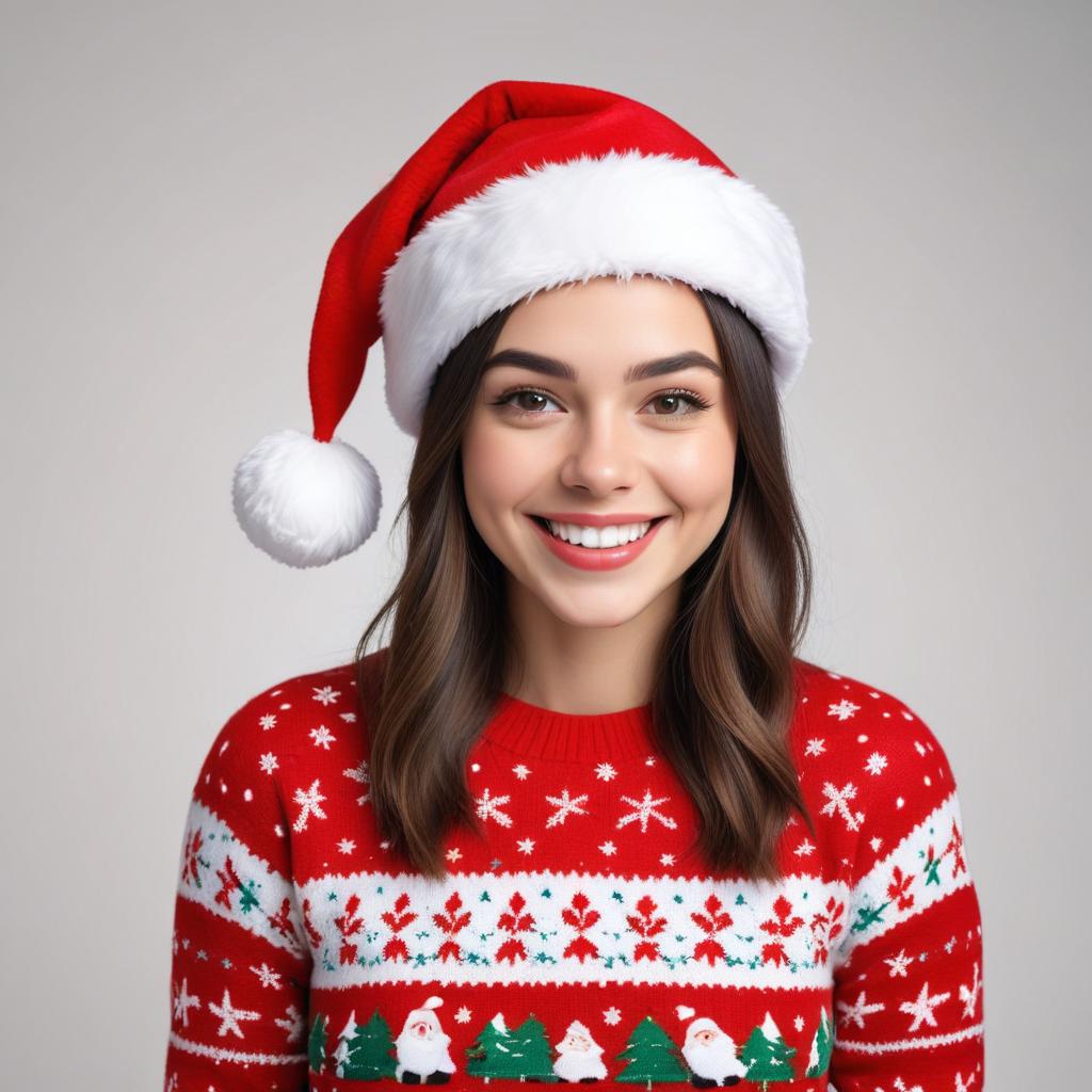 A young woman smiles cheerfully while wearing a red Christmas sweater and a Santa hat, embodying holiday spirit and joy.