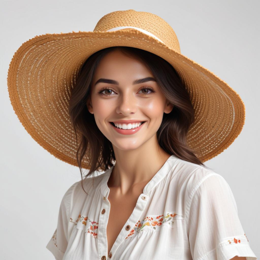 A young woman poses with a wide-brimmed sun hat and a cheerful smile. She wears a light blouse and her hair flows softly around her shoulders.