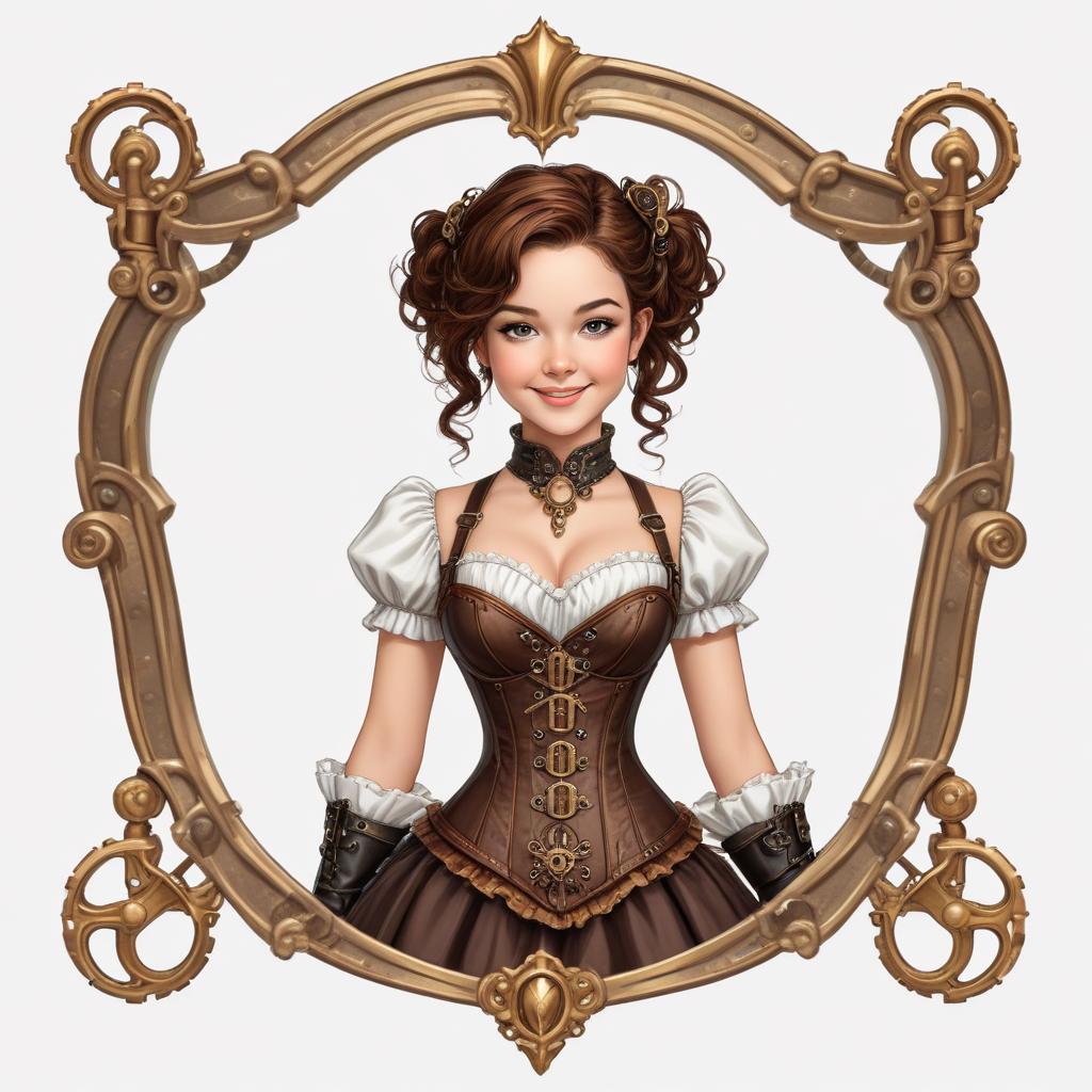 A young woman with curly hair wears a brown corset and a frilly white blouse. She poses within a decorative frame, exuding a steampunk vibe.