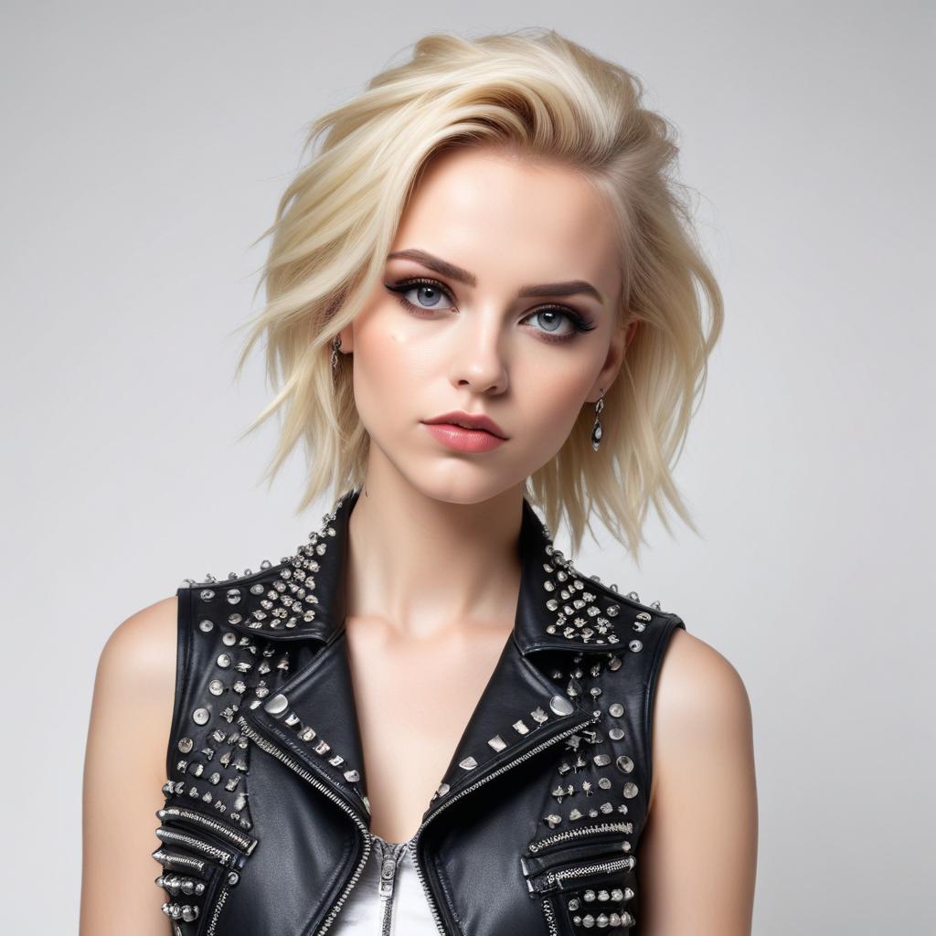 A young woman poses confidently, showcasing a modern hairstyle and stylish leather vest decorated with studs.