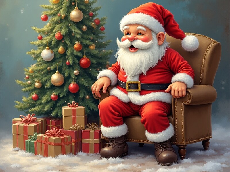 Santa Claus sits comfortably in a chair beside a decorated Christmas tree, with colorful presents stacked nearby, creating a festive atmosphere.