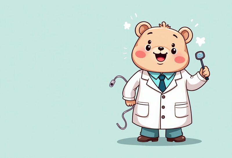 A cheerful bear dressed as a doctor holds an instrument, smiling against a light blue background. Colorful and friendly, it appeals to children.