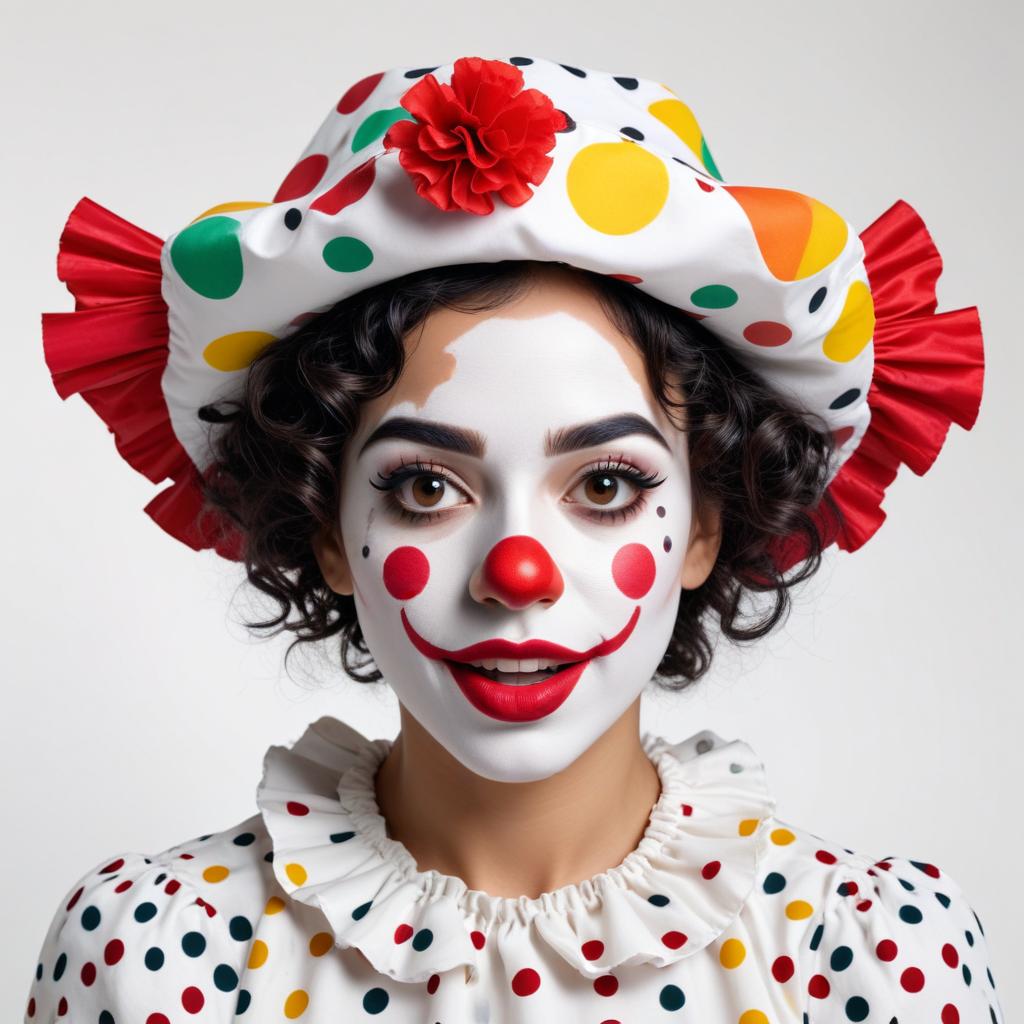 A joyful clown poses with a bright hat and polka dot outfit. Her painted face and smile create a cheerful atmosphere ready for fun.