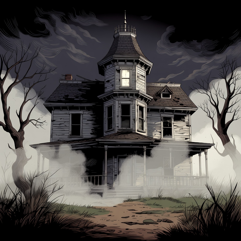 An eerie, abandoned house stands amidst fog and bare trees, creating a spooky atmosphere during twilight.