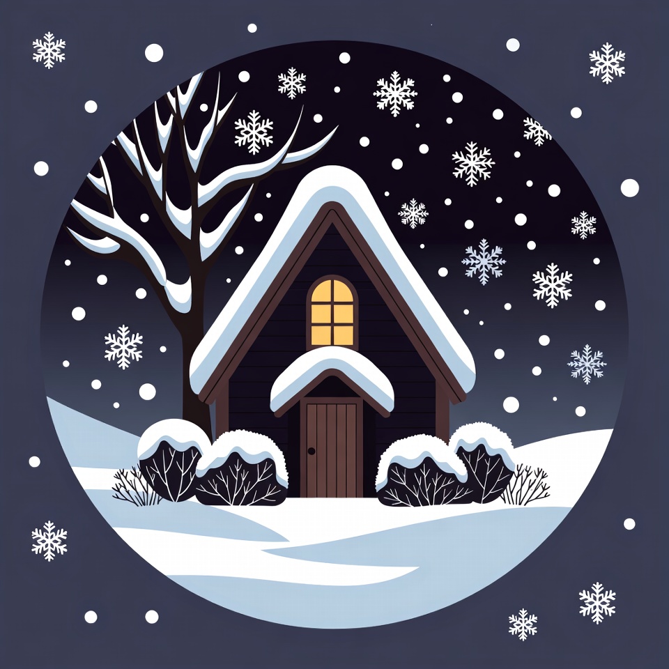 A small cabin covered with snow stands alone in a winter landscape, illuminated by a warm light from its window amidst falling snowflakes.