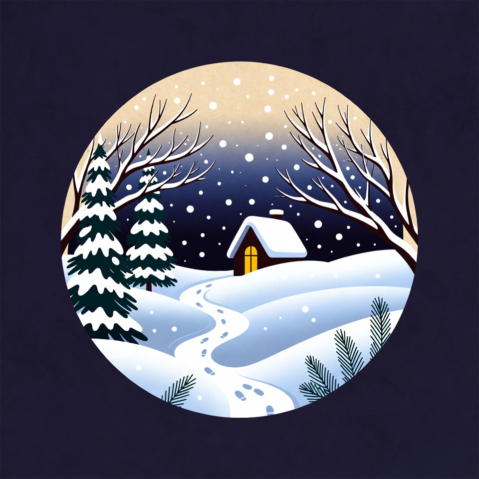 Soft snow blankets a charming house in a winter landscape with tall evergreen trees and a gentle path leading to the door under a starry night sky.