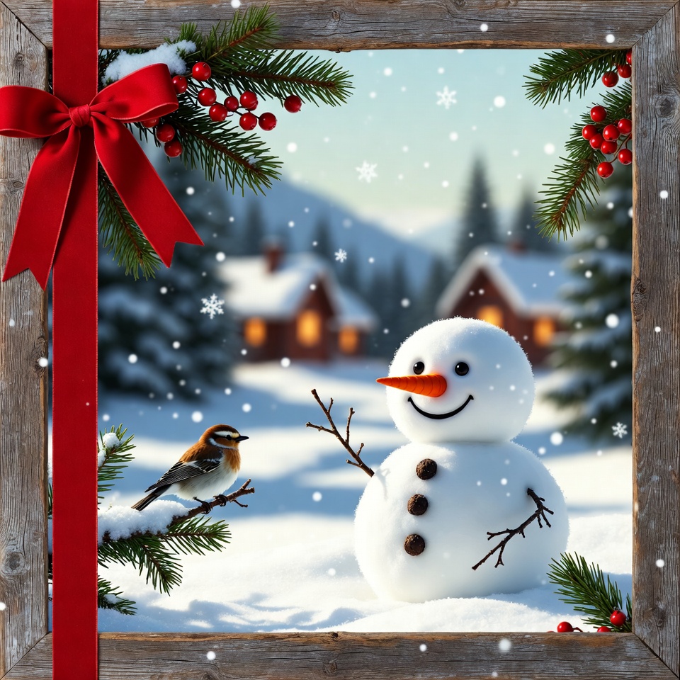 A cheerful snowman stands in a snowy landscape with a bird perched nearby. Cozy cabins are visible in the background, surrounded by pine trees.