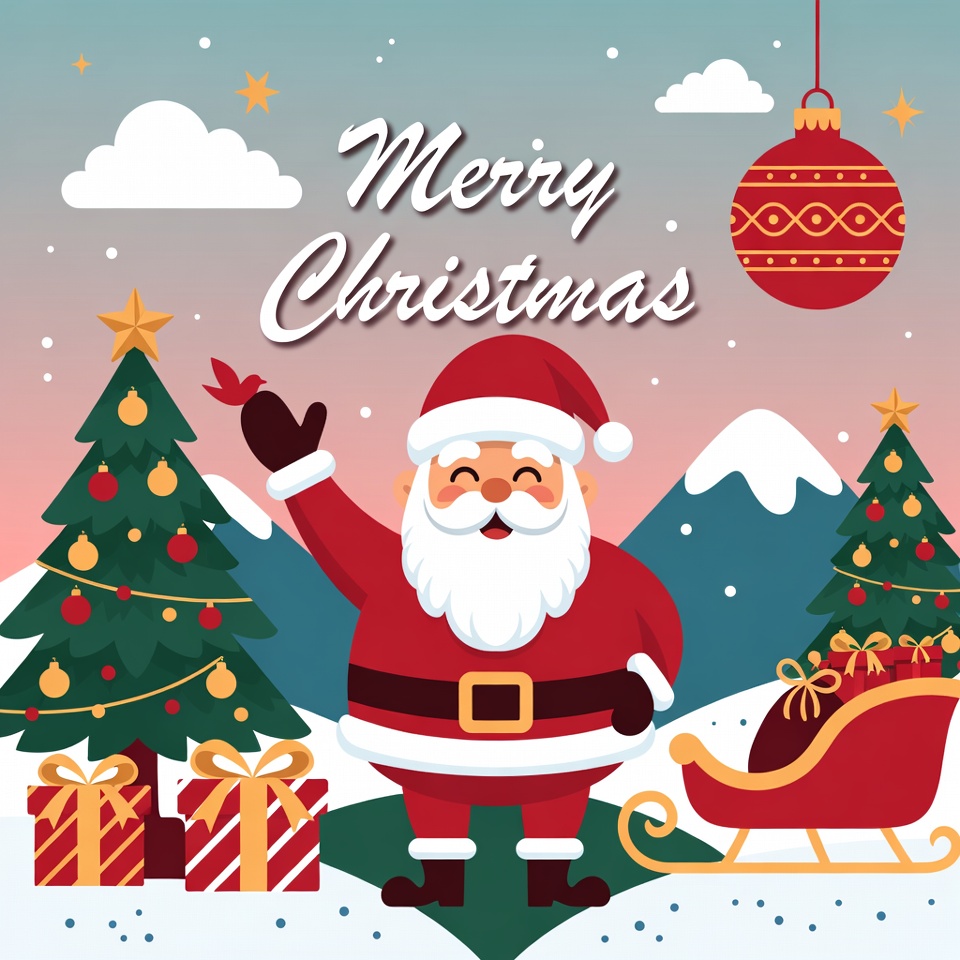 Santa Claus waves joyfully in a snowy landscape, surrounded by Christmas trees and decorated gifts, capturing the festive spirit of the holiday.