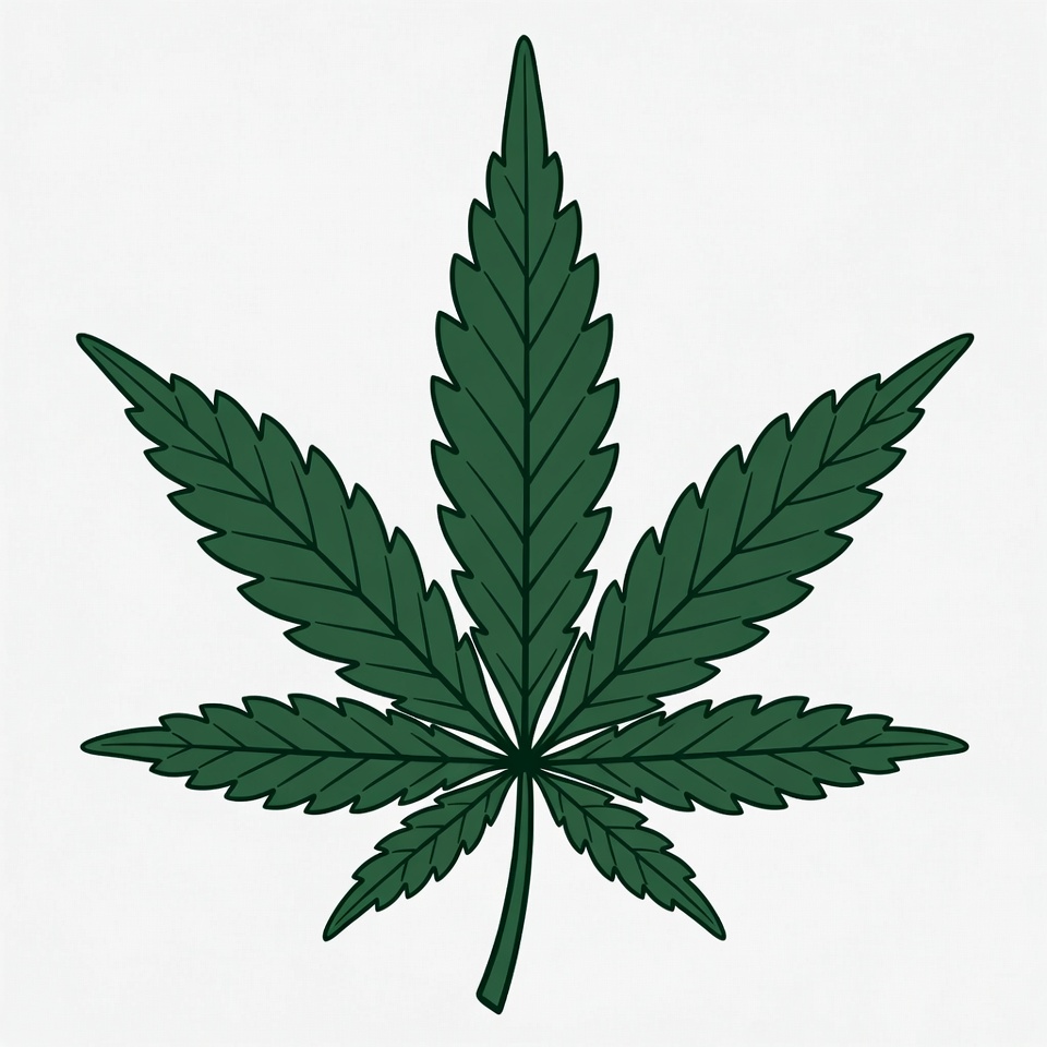 Detailed illustration of a green cannabis leaf with multiple leaflets. The background is plain white, highlighting the leaf's shape and color.