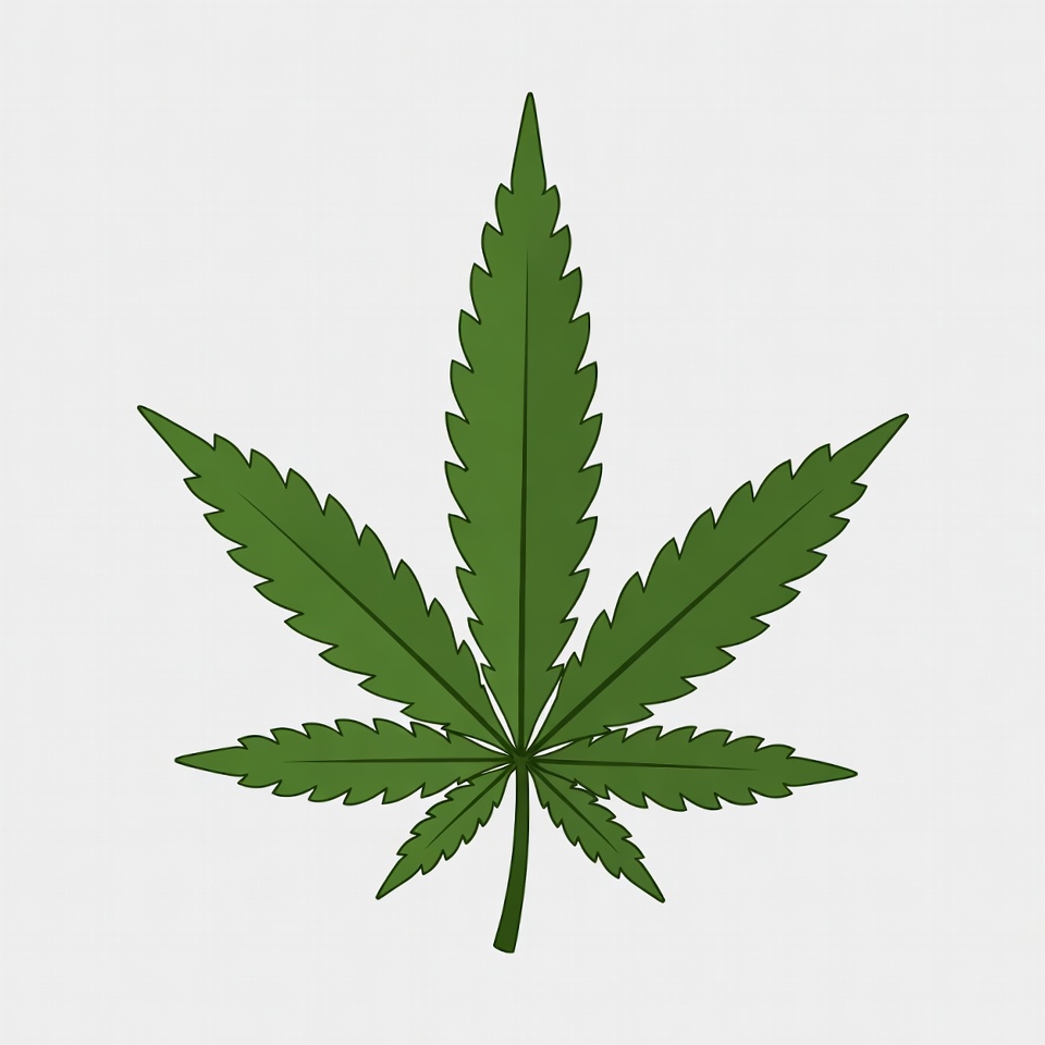 A detailed green cannabis leaf illustration features prominent serrated edges and a distinct shape, showcasing its natural beauty.