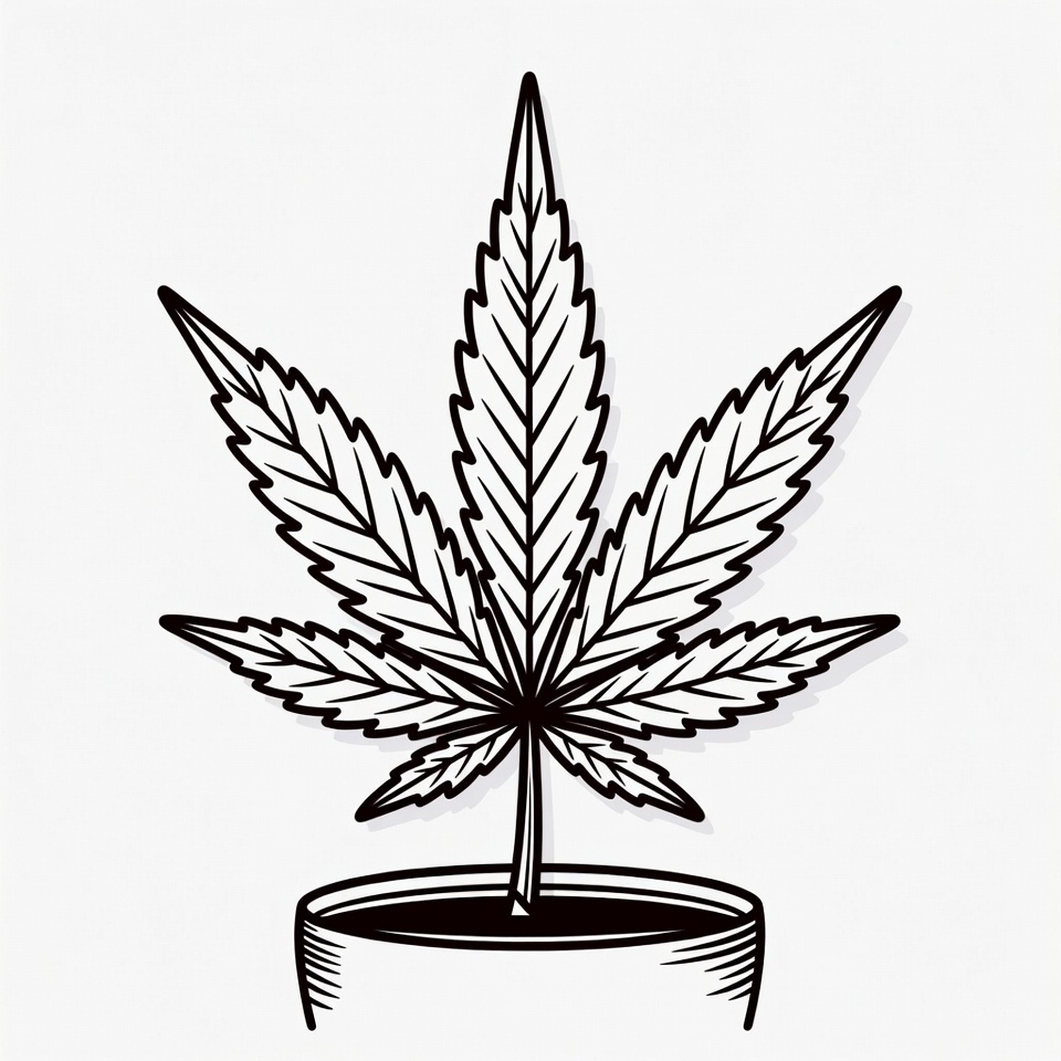 A detailed drawing of a cannabis leaf emerging from a simple pot highlighting the intricate leaf structure and textures.