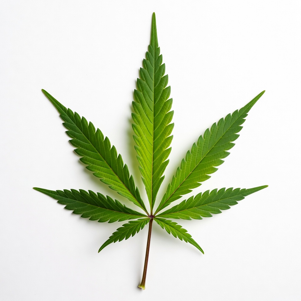 Bright green cannabis leaf displayed against a white background, showcasing its distinctive shape and texture under even lighting.