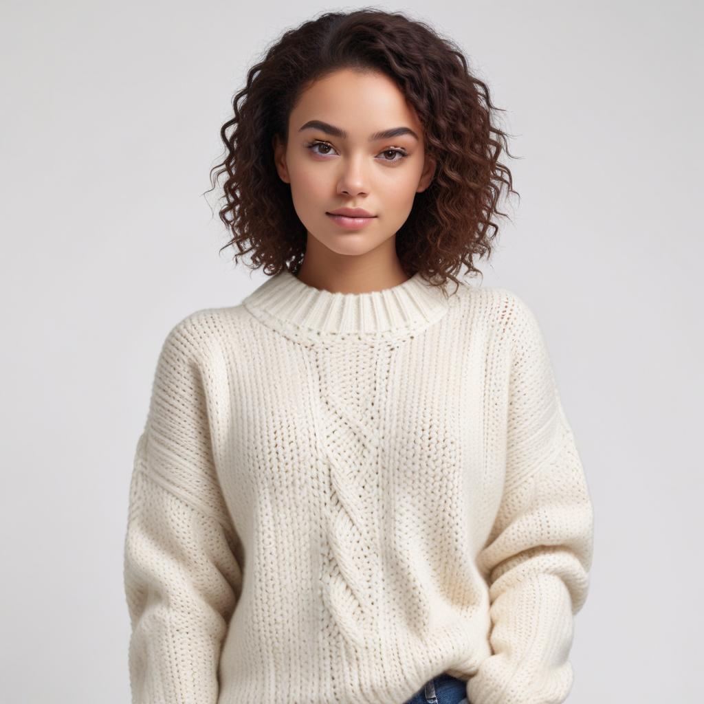 A young woman poses confidently, wearing a cream-colored sweater. Her curly hair frames her face, giving a warm and inviting look.