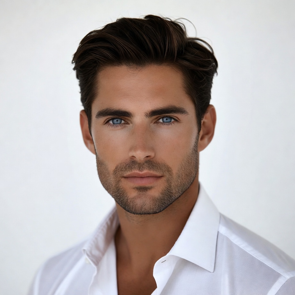 Young man with striking features and dark hair poses confidently. He wears a white shirt and gazes directly, creating an engaging presence.