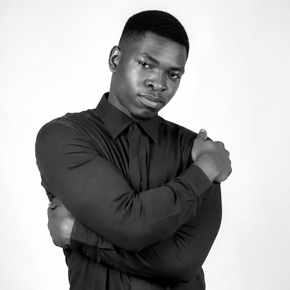 A young man stands with arms crossed, wearing a black shirt. He displays confidence with a serious expression against a simple background.