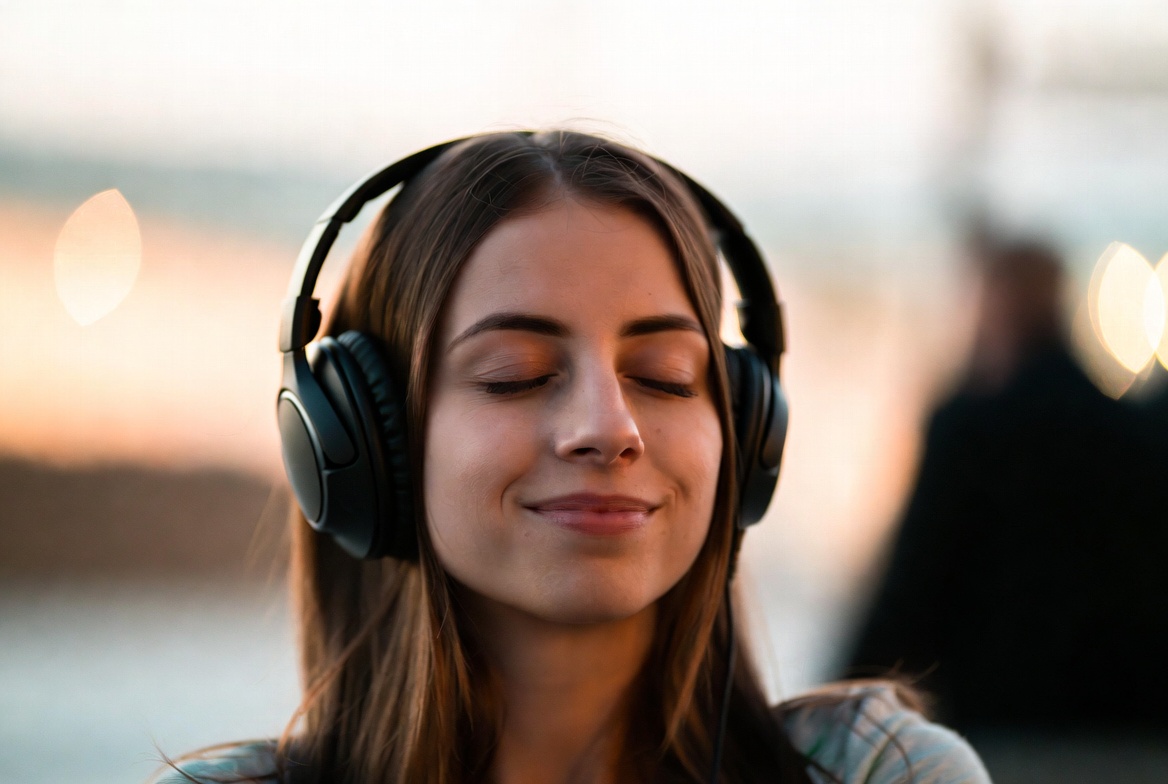 Young woman listens to music with headphones, enjoying a calm sunset. Soft sunlight creates a relaxed atmosphere in the background.