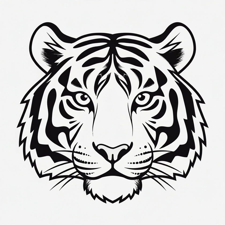 Bold black and white illustration of a tiger's head, showcasing its fierce expression and intricate details of its fur pattern.