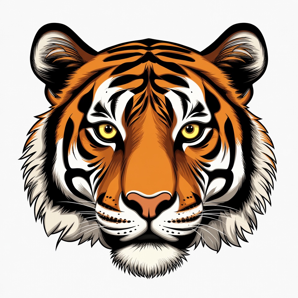 A highly detailed tiger head illustration showcasing striking orange and black stripes, sharp eyes, and a fierce expression, ideal for wildlife art.