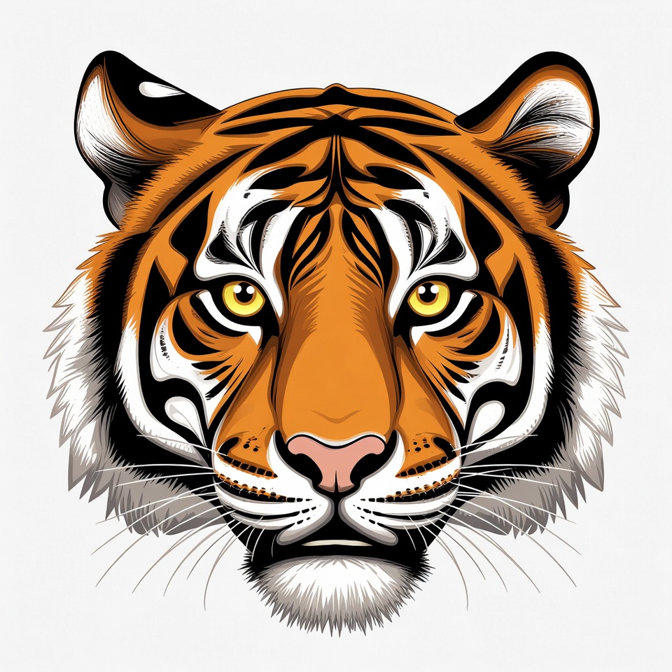 Bold illustration of a tiger's head featuring striking colors and detailed facial markings, showcasing the animal's fierce beauty and power.