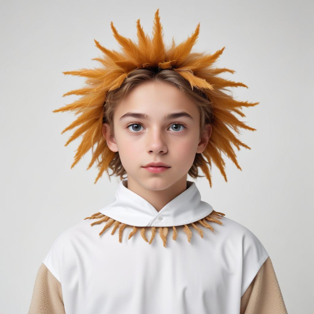 A young child wears a costume with a white outfit and a bright, spiky headpiece resembling sunlight, showcasing creativity and imagination.
