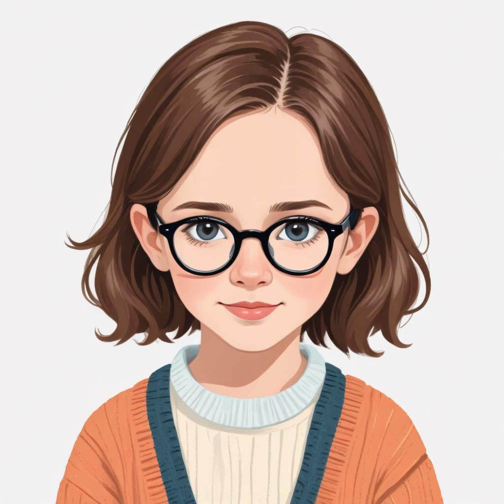 A young girl with brown hair and glasses smiles gently. She wears a cozy orange sweater and a white shirt underneath, creating a warm look.