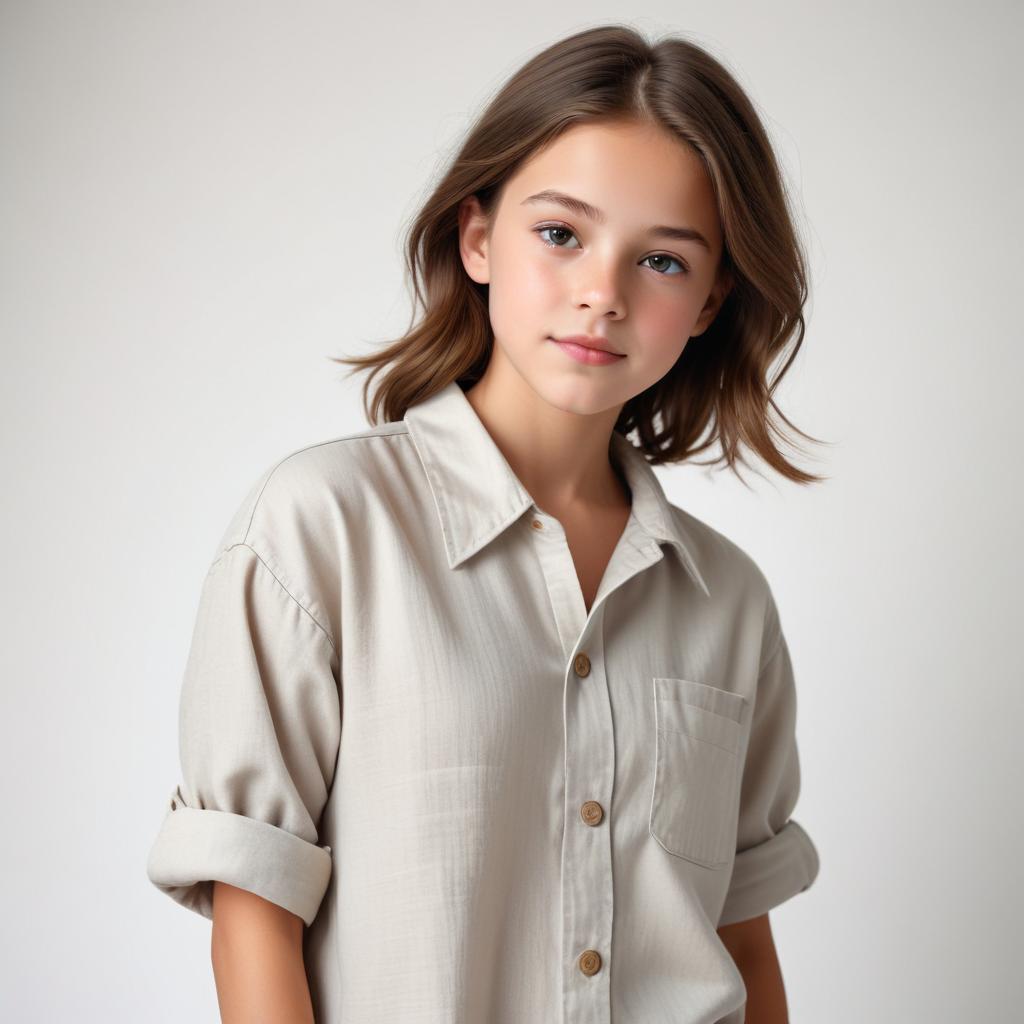 A young girl stands with a gentle smile, wearing a light gray shirt. Her hair is styled effortlessly, adding to her relaxed look.