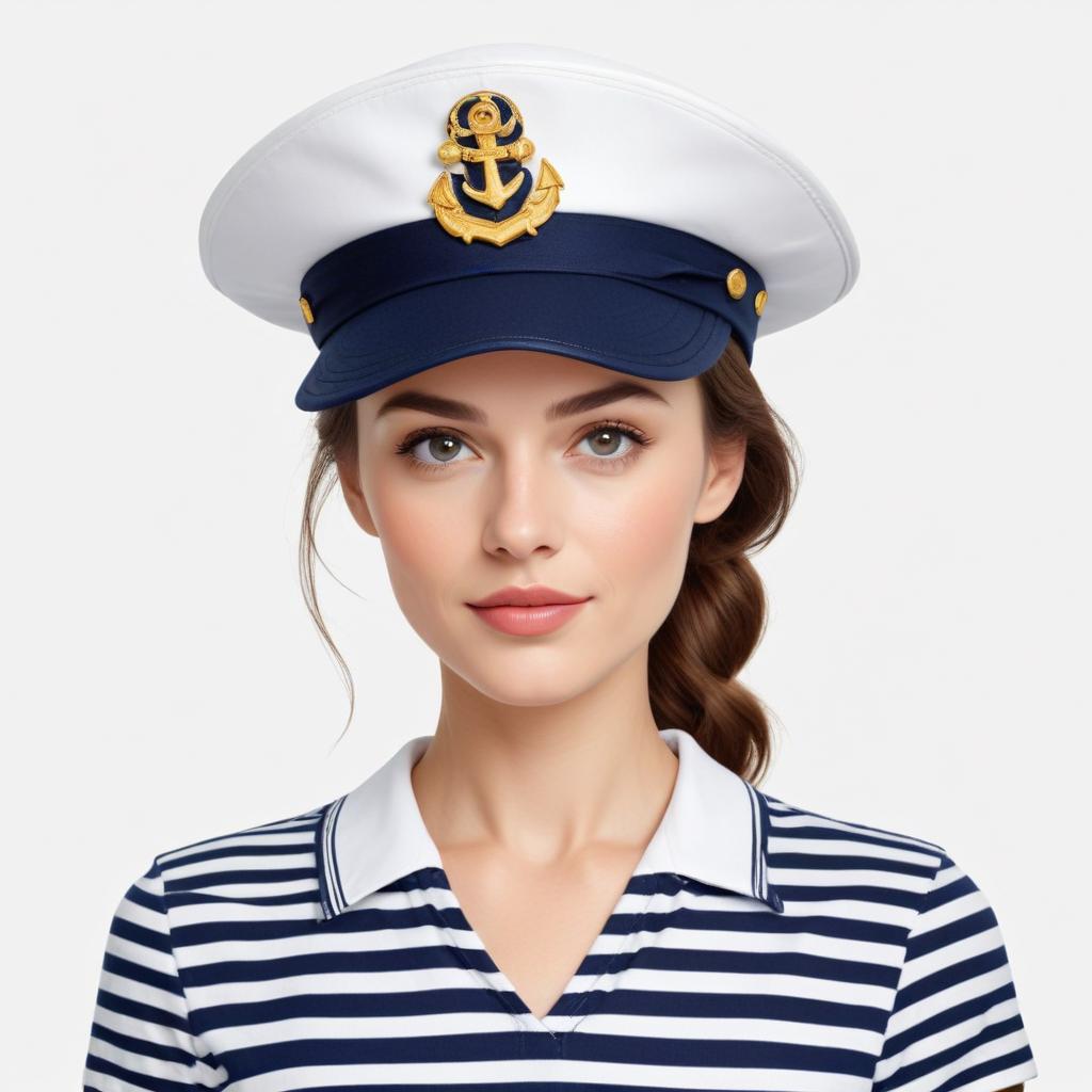 A young woman wears a navy and white striped shirt with a captain's hat, posing confidently against a plain background, showcasing nautical fashion.