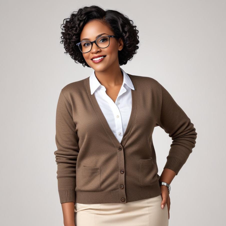 A woman with curly hair and glasses stands confidently indoors, dressed in a brown cardigan and white shirt, smiling warmly at the camera.