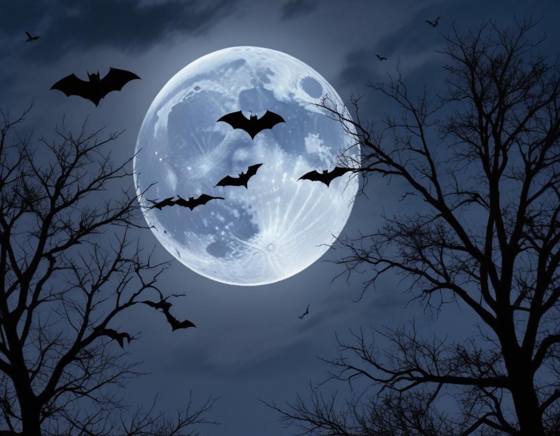 animal behavior, autumn, bats, dark, eerie, flying, forest, full moon, landscape, moonlight, mysterious, nature, nocturnal, outdoors, scenery, shadows, silhouettes, spooky, trees, wildlife