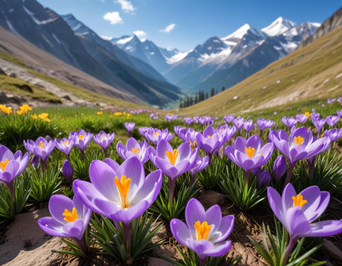 alpine, beauty, bloom, crocus, flora, flowers, greenery, hiking, landscape, meadow, mountains, nature, outdoors, petals, purple, scenery, spring, sunlight, travel, valley