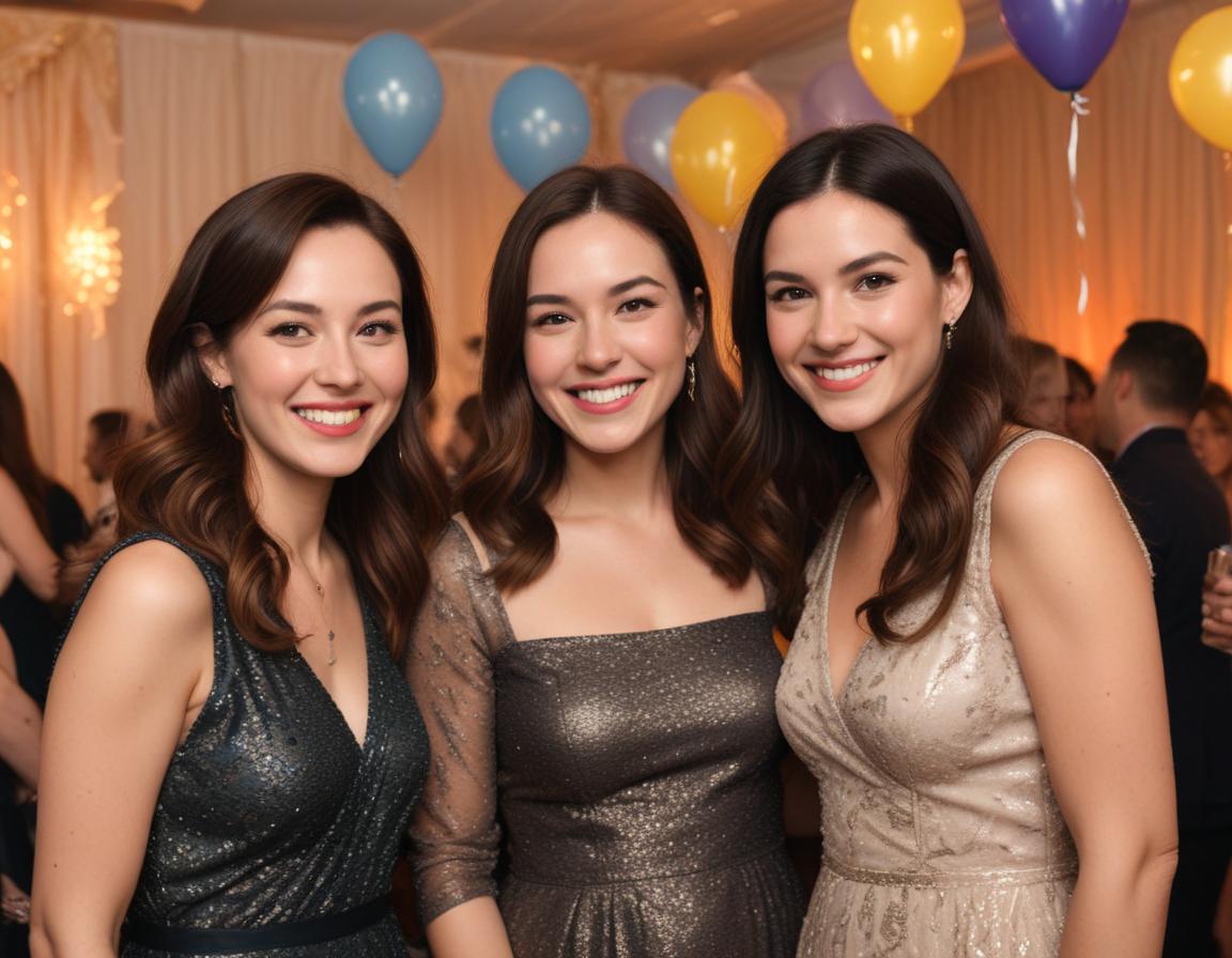 attire, balloons, celebration, cheerful, elegant, evening, event, festive, friends, fun, gathering, happiness, joy, moment, party, smiles, social, sparkling, together, women