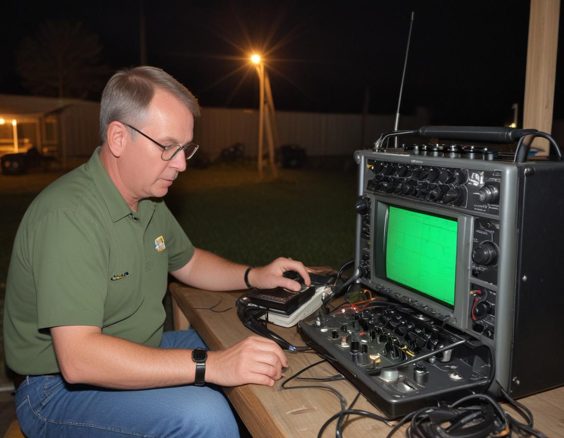 A technician focuses on adjusting communication equipment outside at night, surrounded by darkness and distant lights, ensuring proper function.