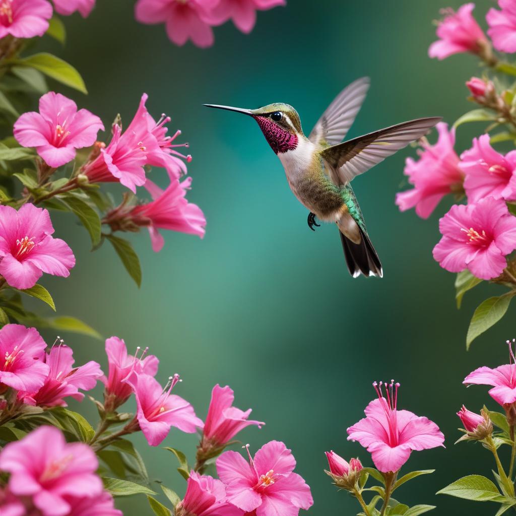 A vibrant hummingbird flutters in front of blooming pink flowers, enjoying the warm sunlight in a lush garden setting.