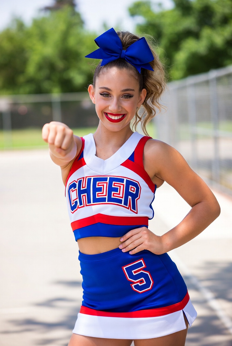 Cheerleader celebrates with a fist pump while wearing a bright outfit in a park setting, showcasing team spirit and confidence.