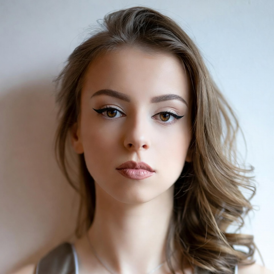 A young woman poses with a neutral expression, showcasing her wavy hair and minimalist makeup against a simple background.