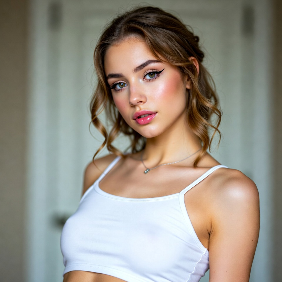 A young woman stands gracefully in casual attire, showcasing her natural beauty and poise in a softly lit indoor setting.